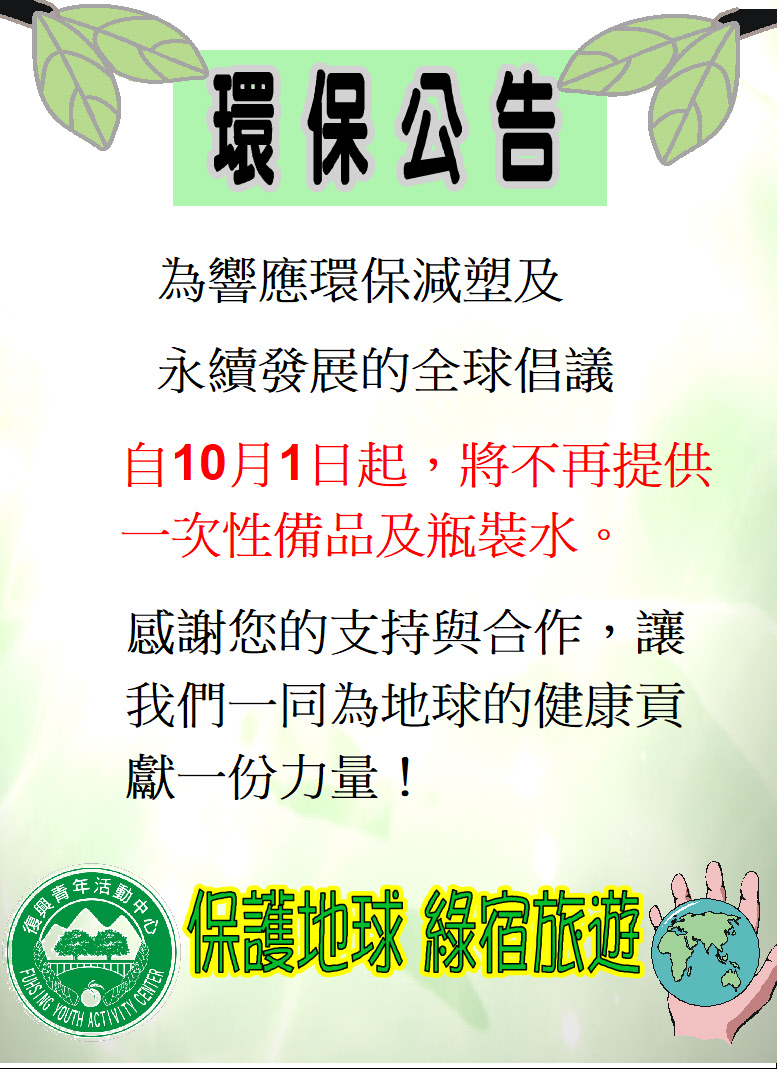 自113年10月1日起,將不再提供一次性備品及瓶裝水。