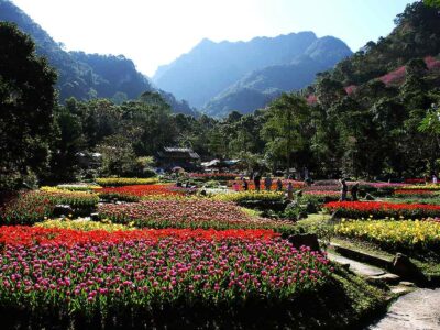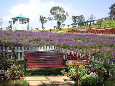 在十七公頃的農場裡到處都充滿了花!在「紫色夢幻區」裡,種滿了近兩公頃的薰衣草、鼠尾草等紫色香草花卉。在「彩虹花田」裡則種著像彩虹一樣,有著一道道鮮艷美麗的各色花卉,而且四季都會更換不同的顏色和花卉。再來,「風情萬種區」裡大溪花海農場種的是多年生的灌木植物。最後,在「天國之丘」,您會看到一顆樹座落在大片的花田裡,那就是偶像劇「天國的嫁衣」片頭前三秒出現的那一棵樹喔!大溪花海農場一日行,異國風情不用出國去!